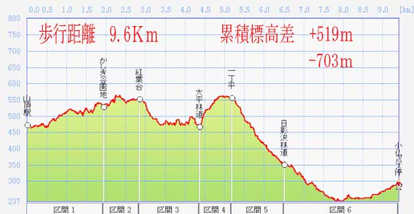 山頂駅→かしき谷園地→紅葉台→学習の路→一丁平→日影沢林道→小仏バス停