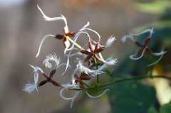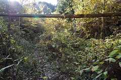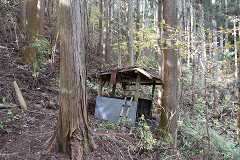 登り始めて直ぐに林道は終点となり沢に沿った登山道を登って行く。このルートを利用する登山者は少ないようで少々荒れた所もあるが道筋は確りと付いていて迷う所は無く10時過ぎて登り始めたので沢筋の登山道まで陽が射してくる。沢筋の明るい自然林が終わり薄暗い植林帯の中をジグザグに登って行くと朽ちた作業小屋が有り奈良子峠が近くなる。