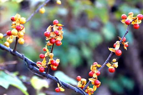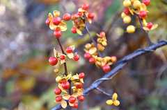 昼食後は山頂付近の一回りして紅葉やツルウメモドキなどカメラに収めてから巻路を利用して縦走路に出て奈良子峠を見送り明王峠を通過して底沢峠から陣馬高原バス停に向かって降る。底沢峠からのコースは往路のセツ久保に比べると道筋も確りしていて利用者が多くいる事が解るが本日は登りのセツ久保、下りの底沢コース一人も逢う事は無く静かな山歩きだが少々寂しさもあり。