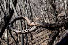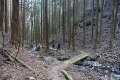 十分展望を楽しんだ後は鞍部(コル)の降りて仁田岳の山頂を通過して椚田峠に保護地を降り往路と同様に沢筋の登山道をほぼ直線状に降る。登山道も良く整備されていて数か所に手作りベンチもある。沢には丸太の橋が数か所出来ていて良く整備されている。