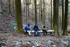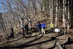 素早く登山準備をして植林帯の中の沢に沿ってほぼ直線に登って行く。以前と比較すると間伐されて様で登山道も明るく感じる。また登山道も新たに出来ていて新道の標識もある。次第に傾斜がきつくなり明るくなってきて鳴神山直下の肩の広場(稜線)に出る。此処に新しく小さな休憩小屋が出来ていて中で昼食にする。寒い空っ風が吹き抜ける所なので休憩舎は有り難い。