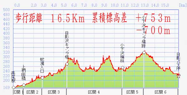 高尾駅→上椚田橋→小仏川遊歩道→日影沢キャンプ場→小下沢梅林→小下沢キャンプ場跡→小下沢梅林→日影バス停