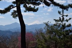 小仏城山山頂からは富士山の展望もあり多くの登山者が来ている。前回はロウバイと富士山だが今日は桜、桃と富士山の絵になる。一丁平を経て5号路から冨士道を通り数年ぶりに蛇滝に降り日影沢まで旧甲州街道を戻る。