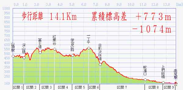 山頂駅→4号路→いろはのもり→冨士道→紅葉台→大平林道→一丁平→日影沢林道→旧甲州街道→小仏川遊歩道→高尾駅