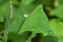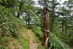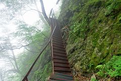 四国の山2日目、朝6時に出発土小屋ロッジ脇から手箱山を目指す。天候は時折青空も見える曇り空で樹林帯の中の登山道は薄暗く花もあまり見かけないので寂しい。樹林帯を抜けた所で岩黒山の路と合流する丸滝小屋(修行場)前に出る。此処は明るいので水分補給で小休止。鉄製の桟橋や梯子等もあり慎重に通過する。