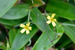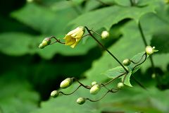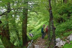 滝となって落ちる沢筋を桟橋で渡り急斜面の岩山を降って行場の小屋を過ぎてキレンゲショウマの群生している所に来ると数名の登山者が同じ目的で降りてくる。此処も咲き始めで黄色の蕾が多いが満開に咲いた時の様子は想像できる。四国の山旅最終日目的の花も見られて5年越しの計画も実行できて、充実感、達成感を味わいながら帰り道を辿る。(この後松山までの長い道のりが有る)