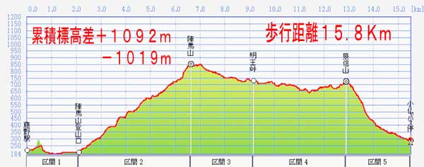 巻路で時間を稼いで景信山の登りになりスローダウン、2:30分景信山山頂に到着。山頂で展望を見ながら小休止、此処で高尾に向かうか思案したが足も少し痛みも出てき他事で高尾へは諦めて小仏に降る事にする出る。最短のヤゴ沢を降る(山友さんからの情報で一部荒れているが通行可)16:00小仏バス停に到着。15.8Km 7時間30分 32000歩