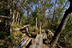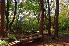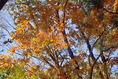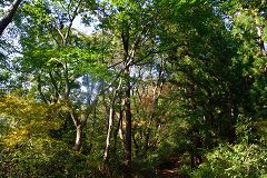 早朝は雲が多く肌寒く感じる陽気で長袖の上着を着て歩き始めたが、次第に青空が広がって来て木々の葉が輝いて来る。まだまだ緑色が濃いが所々で黄〜赤色に染まった樹木もあり秋を感じる。先日の台風の影響で通行止めも有り人影が少なく各所のベンチでも休憩している人が見られない。