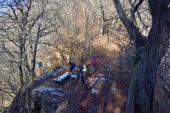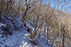 少し登るとお坊山の山腹の水平道になり約1.5Kmで大鹿峠に到着。此処で小休止し水分補給。大鹿峠からはお坊山の急な登りとなり積雪も5センチ程ありスリップに注意しながら登る。気温も低く0度ほどで雪解けの泥濘は無く雪山歩きを楽しめる。