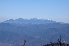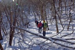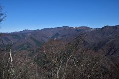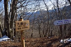 暖かい昼食、展望を十分楽しめたので大鹿峠まで下山する。途中積雪の急斜面ではスリップ転倒、登りは良いが降りは要注意!! 折角来たのだからと大鹿峠から大鹿山を往復してくる。此方は南側の斜面の登山道で積雪真全く無しで枯葉の積もった山道の陽だまりハイク。大鹿峠からは再び雪山歩きを楽しみながら下山する。(15:20)