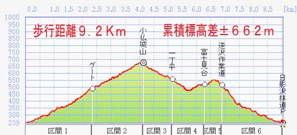 日影沢林道P→ゲート→小仏城山→一丁平台→富士見台→逆沢作業道→日影沢林道P