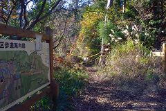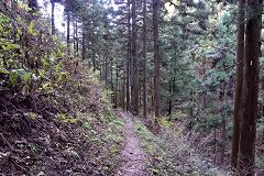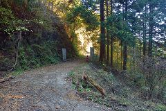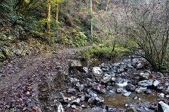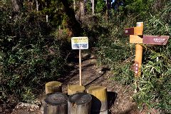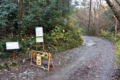 何時も閉っているゲートは開いたままで、ゲートの少し先に山側からの崩落が有るがその先は全く被害が見られない。小仏城山直下の巻道との交差点にロープで日影沢方面は通行止めになっている。小仏峠方面も崩落の写真入りで通行止めになっている。