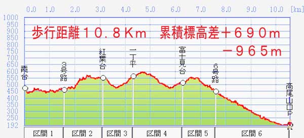 山頂駅→2号路→3号路→5号路→紅葉台→一丁平→一丁平展望台→冨士見台→稲荷山コース→6号路→高尾山口