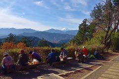 再び一丁平へ戻り空いたベンチで昼食にする。隣のテーブルでは江戸川区から来られてグループが昼食会中でジンギスカン鍋とワインをご馳走になる。タイミング良くKUさんが来て一緒にご馳走になる。
