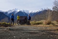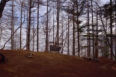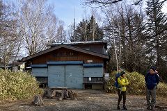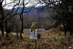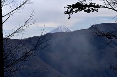 暖かいおしるこ等で体も暖まり白根三山の展望を十二分に楽しめたので高谷山に向かう。途中のカラマツ林の合間から隣の櫛形山の上に顔を出した富士山が望める。高谷山山頂は周りの樹木であまり展望が良くないが三等三角点が有り桃の木温泉への標識もある。昔、桃の木温泉から高谷山を目指したが進路を間違えて途中から引き返した忘れられない苦い経験が有り。高谷山からは往路を戻り夜叉神の森登山口に無事戻る。同行のYさん案内のAさんに感謝。