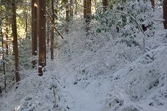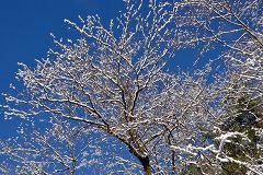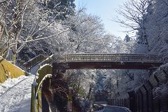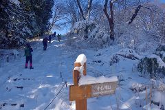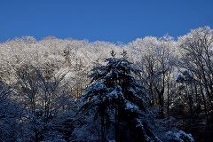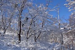 陣馬を後に雪景色の見られる有利な大垂水に行く先を変更。高尾山口辺りは雪は少なかったが大垂水辺りは真っ白に雪化粧している。大垂水から登り始めた所で写真撮影しているSさんお逢いして同行する事になる。陽が登り始めて気温が上って来たが未だ此の辺りは白一色で雪山歩きを楽しめるが時折雪の爆弾の直撃を受けるので帽子の上からフードを被って行く。