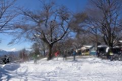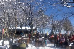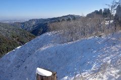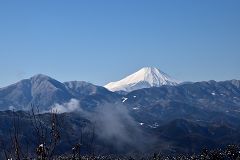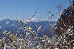 一丁平への登山道は既に3名ほどの足跡が続いていたが巻路に入ると足跡が無く新雪を踏締めての歩行が出来、木の合間からの富士山も鮮明に見える。一丁平から小仏城山へ登り雪を被ったロウバイと富士山を撮影後テーブルに積もった15センチほどの雪を払って昼食にする。晴天で春の陽気となった日曜日で富士山の展望も良く多くの方で賑やかになって来た。