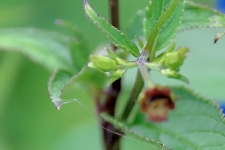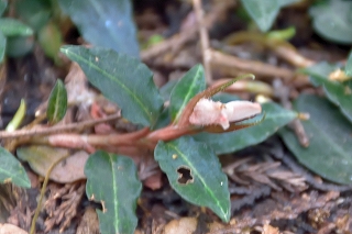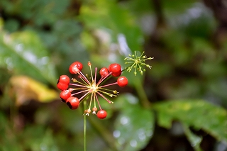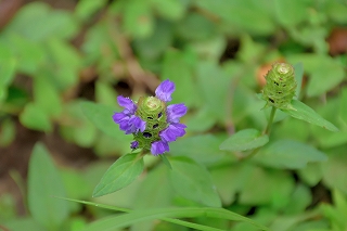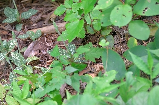 久々の大垂水からの登山、今回も相模湖駅前の喫茶店でバスの発車時間まで時間調整。大垂水で数名の登山者も降りて各方面に消えてゆく。台風の影響で曇り空が幸いして時折流れてくる涼風が気持ちよく楽に歩くことができるがやはり登りの山道は。汗がにじみ出てくる。一ひと登りした分岐点で水分補給で小休止。近辺を探索後脇道へ入って行く。道筋を外してしまい何時も見慣れた様相と違う所で方向が分からなくなり少しうろついてしまい目的の花は見る事が出来ず。縦走路に出てベンチの所で休憩する。