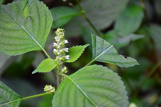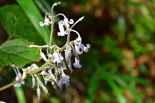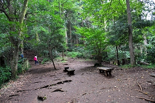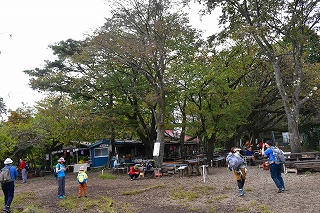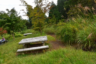 途中、イロハの森コースの分岐を通過して最後の階段を登り詰めて高尾山直下の1号路との合流点に出て5号路を利用して一丁平を目指す。もみじ台北牧路ではセキヤノアキチョウジが咲き始めていた。。一丁平の登りではツリガネニンジンの花が見られてススキの根元では色の濃いナンバンキセルも未だ咲いている。朝は雲の多い薄暗い天候の下での山歩きが青空に白い雲となり陽も射して来て気持ちが良いので一丁平のテーブルベンチで昼食休憩にする。