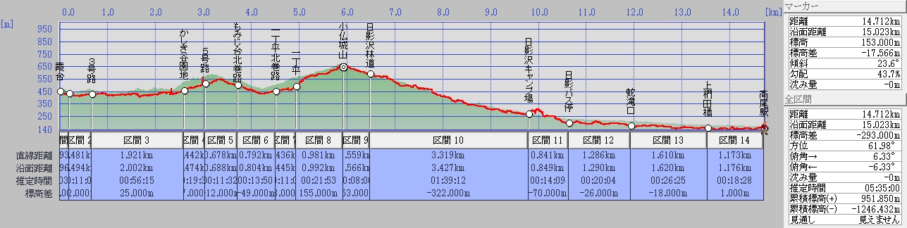 霞台→2号路→3号路→5号路→一丁平→小仏城山→日影沢林道→小仏川遊歩道→上椚田橋→高尾駅