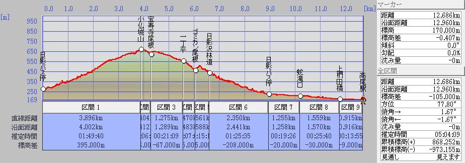 日影バス停→日影沢林道→萩原作業道→一丁平→小仏城山→一丁平→萩原作業道→日影沢林道→小仏川遊歩道→上椚田橋→高尾駅