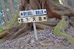 登山コース 登下農道P →要害山登山口→尾根筋 大倉 登下分岐 →要害山→尾根筋 大倉 登下分岐一風の神→520m→登下農道P 前回のコヤシロ山に続き、今回も登下農道Pから52mの尾根筋に登り風の神経由 要害山まで登る予定でいたが、要害山10分の標識があるのを見付けて、標識に従って入って行く。民家の敷地の裏に階段があり階段を上ると表面に洞があり、左に山の斜面に登山道がある。此処は登山地図には記載されていない登山道だが過去には西側の大倉への最短距離なので利用されていた様だ。登山口から10分ほどで尾根筋の峠、大倉 登下 分岐点の標識がある。この峠の尾根筋分岐点を左要害山方面に向かうと直ぐに明るくなり目前に山頂が見えてくる。