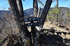 要害山は明るく周りには遮る樹木等は全く無く360°の展望があり。予想外の富士山の展望に山頂でゆっくりコーヒーを飲みながら素晴らしい展望を満喫する。 山頂で十二分に展望を楽しんだ後往路を戻らず尾根筋の道を前回登ったコヤシロ山に向かう。大倉、登下の分岐を通過して風の神を超える登山道が露岩の足場の悪い斜面でトラロープ設置されているがゆっくりと慎重に足を運び通過する。前回コヤシロ山に登った時のルート上の520mのピークの所でコヤシロ山まで行って戻ると時間的に長寿館の閉店時間14時30分に間に合わなくなるのでコヤシロ山へは行かず此処から登下農道の駐車場所に降る事にする前回往復した所なので状況が解っているので今回は急斜面を咲けて緩やかに下って楽に駐車した所に戻れる。早速車に乗り長寿館に向かい今回は閉店前に余裕をもって到着出来て長寿館で昼食を済ませる。 今回は短時間での山歩きで素晴らしい展望もあり初めての要害山 感動の山歩きができる。 。