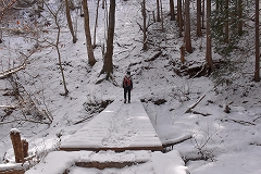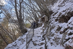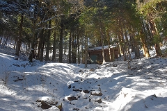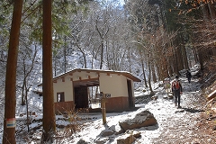 登山コース 御岳平 →長尾平→アクバ峠 →護摩壇岩→大岳神社一大岳山→大岳神社→護摩壇岩→アクバ峠→長尾平→御岳平 晴れの予報と初心者向きのケーブルカー利用で気楽な登山を予想して過去数回、訪れている大岳山を目指す。。 御岳神社を過ぎて長尾平を通過すると昨夜降った雪で次第に足元が白くなる。 ロックガーデン分岐点では新たにトイレ舎が新設されている 小さな沢を綿た辺りから一万真っ白の雪化粧と変わり予想外の行き山歩きを楽しめるがスリップに注意しながらゆっくりと行く。 。