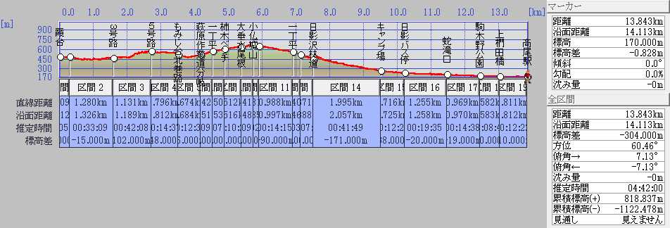 霞台 →浄心門→3号路 →5号路→もみじ台北巻路一萩原作業道分岐 → 丁平→大垂水尾根 → 小仏城山→一丁平→ 萩原作業道分岐→日影沢林道→ 日影バス停→小仏川遊歩道→上椚田橋→高尾駅
