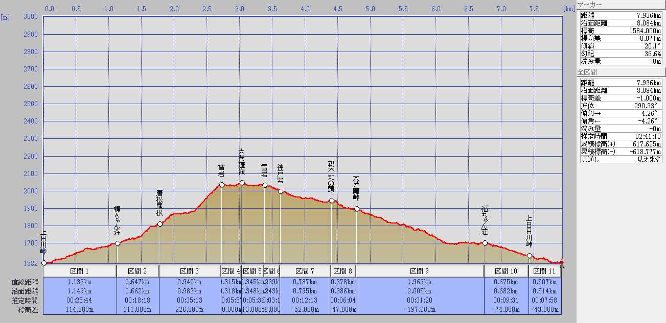 上日川峠10:30 →福ちゃん荘11:00 →唐松尾根 →雷岩13:54 昼食一大菩薩嶺14:22 → 雷岩14:38 → 神戸岩→ 賽の河原 → 大菩薩峠15:42 → 福ちゃん荘16:48 → 上日川峠17:20