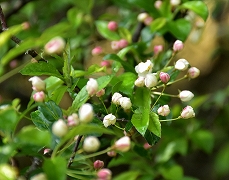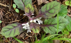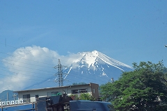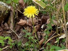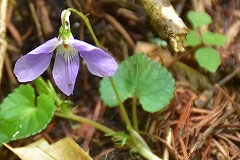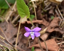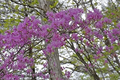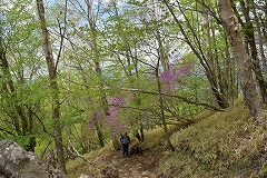 ロッジ脇から車道も利用できるが今回は途中の花を見ながら山道を利用して行く。残雪はなく陽当りの良い所では菫の花が見られる40分ほどで福ちゃん荘のたどり着き車道と合流。此処で小休止してストックを用意する。雷岩まで最短距離の唐松尾根を登って行く。朝 一瞬見えた富士山が気になる所だが展望は無しところどころで紫色の色鮮やかなミツバツツジが見られる。