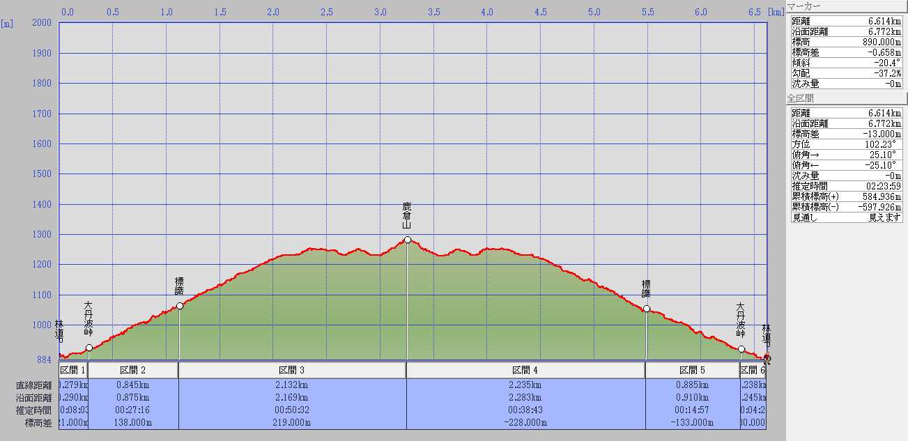 林道P10:32→大丹波峠 10:46→林道 →登山道一標識11:26 → 鹿倉山13:02 → 標識14:47→ 林道 → 大丹波峠15:18 → 林道P15:28