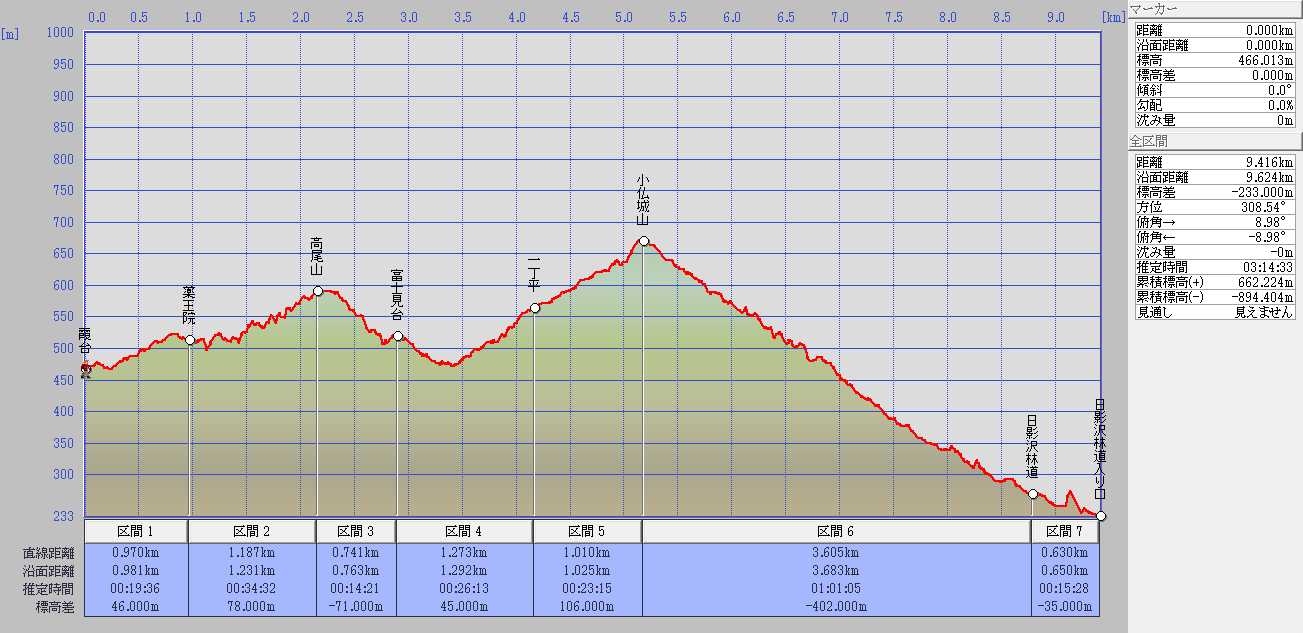 霞台→薬王院 →高尾山→富士見台一丁平一小仏城山→日影沢林道 → 日影沢林道入り口⇒高尾駅