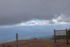 山頂には数名の登山者が昼食休憩していて、我々も正面の富士山を眺めながら途中で用意して来たおにぎり等で丸太に腰を下ろして昼食休憩とする。生憎、富士山の展望は雲が多く半分ほど隠れていて全容は見られなかった。